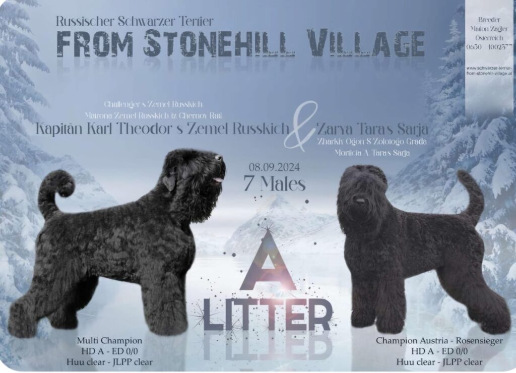 Der Schwarze Terrier ist in Russland um 1940 und bis Anfang 1950 durch ausgewählte Kreuzungen von Rassen wie dem Rottweiler, dem Riesenschnauzer, dem Airedale Terrier, Neufundländer, Kaukasischem- und Europäischem Schäferhund und auch der Deutschen Dogge entstanden. Die ersten Schwarzen Terrier wurden nicht nur als Wachhunde in Gefängnissen eingesetzt, sondern auch als Allround Armee- und Polizei-Hunde. Das diese Rasse dann doch nicht in den Armeedienst übernommen wurde kam daher, dass sie einen gewissen Anspruch an Pflege benötigen. Das Fell muß gepflegt und geschnitten werden. Der Schwarze Terrier gehört zu den Rassen, die lange Zeit zum Erwachsenwerden brauchen. Seine Entwicklung ist erst mit 3 Jahren psychisch und physisch abgeschlossen.